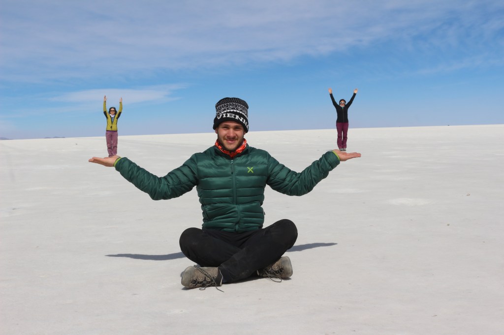 Successivamente scopriamo che questa casa è costruita interamente col sale del deserto, a parte i quattro travi del tetto che sono di legno e il tetto coperto di paglia, mista a piante di coca essiccate. Restiamo qui per il pranzo e nel pomeriggio risaliamo sulle jeep. Ci aspettano più di 100 km attraverso il Salar in direzione dell’”isola Inchauasi” o “Isla del Pescado”. Durante il tragitto facciamo numerose fermate a fotografare. Infatti questo posto completamente pianeggiante si presta molto a far foto con giochi di prospettiva.