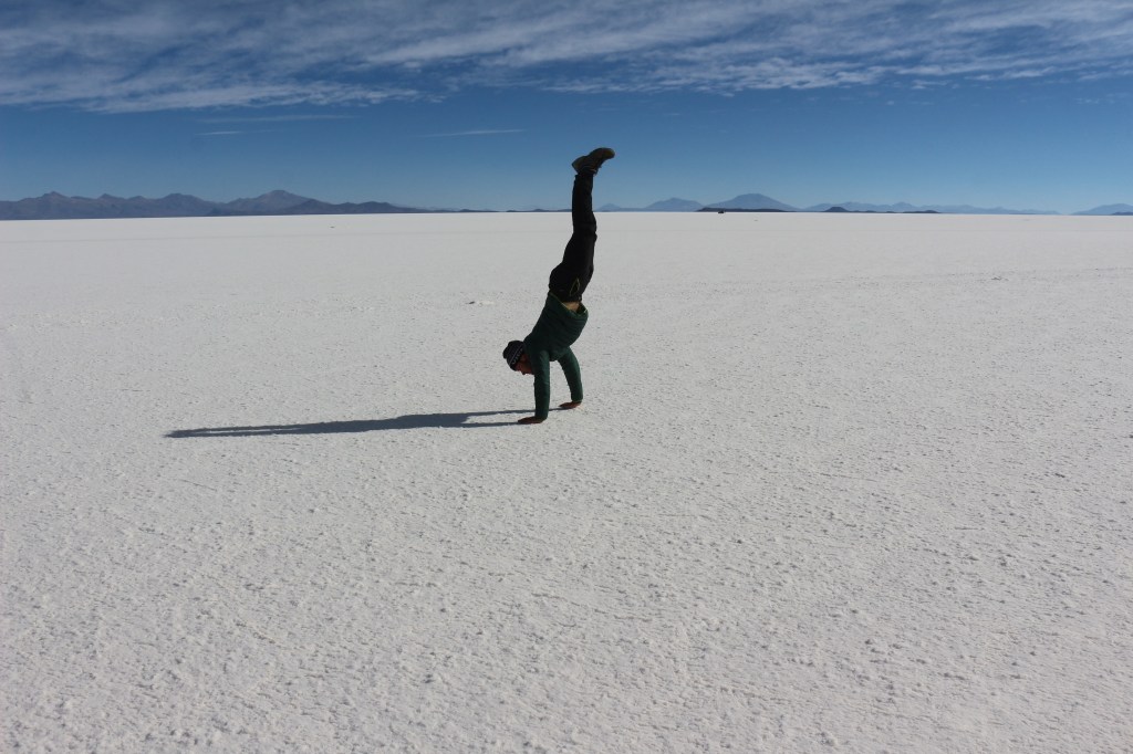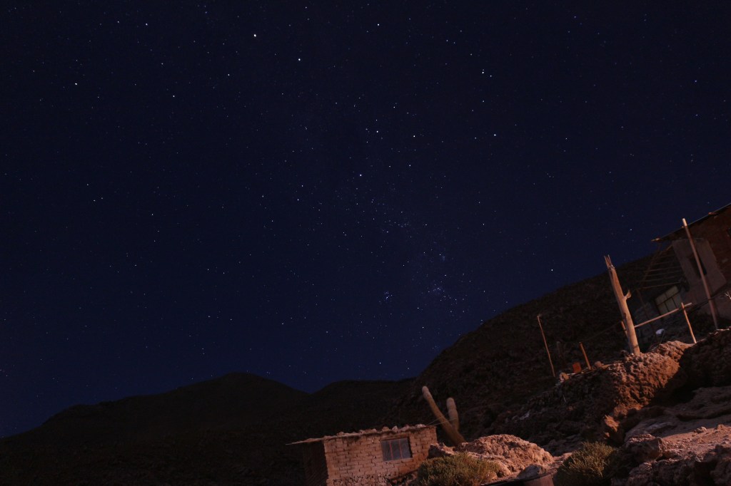 Pochi minuti dopo ripartiamo ed arriviamo al villaggio di “Chuvica”, dove dormiremo al “The Salt Hostel”, un ostello fatto di sale sul bordo del salar. Ci troviamo a una quota di circa 3750 metri. Ci disponiamo nelle camere, mangiamo la cena e poi esco dall’ostello per far foto alle stelle. Mai visto nulla di simile. Osserviamo la via lattea e la croce del sud. Considerata la temperatura freddissima torniamo dentro e giochiamo a carte. Verso le 22 andiamo a dormire sulle brandine fatte di sale.