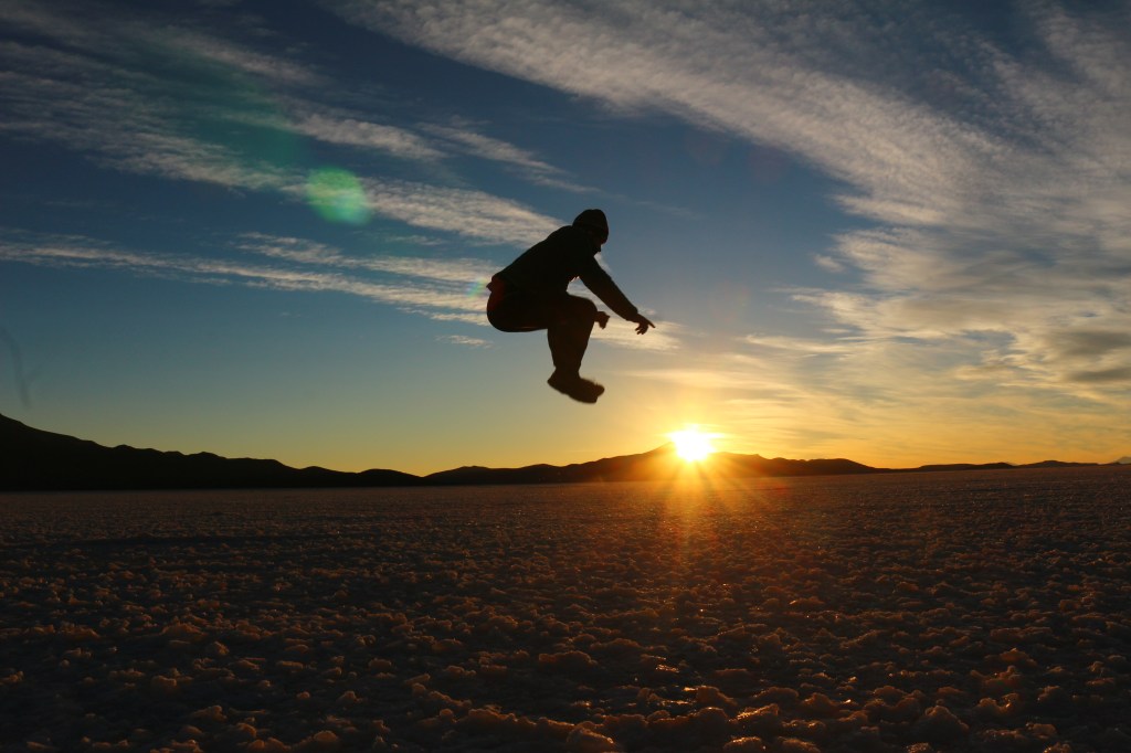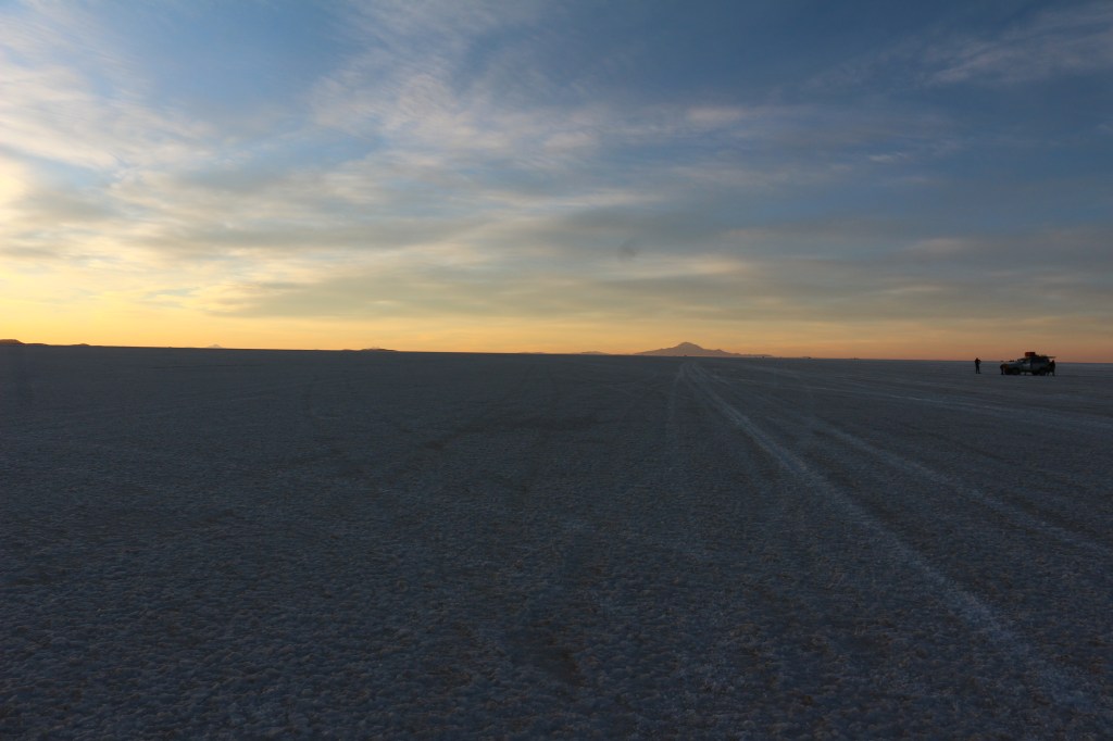 Raggiunti i 3800 metri dell’isola dopo circa un paio di ore torniamo nella jeep ed affrontiamo altri circa 80 km in direzione Sud Ovest dove ci fermiamo ed aspettiamo il tramonto. Il tramonto nel Salar è da vedere almeno una volta nella vita, è meraviglioso. Appena scompare il sole la temperatura precipita drasticamente vicino agli 0°C. C’è un’escursione termica incredibile.