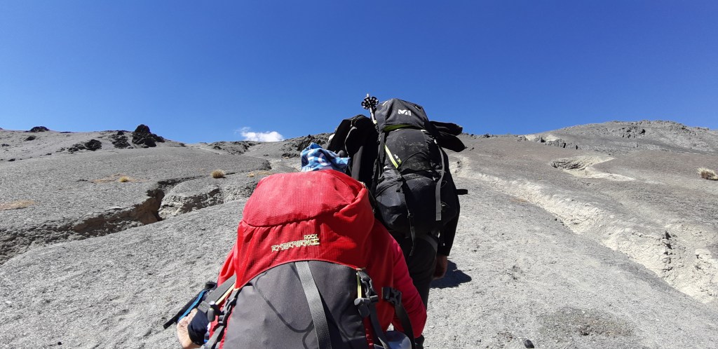 . Il sentiero è al centro della vallata pianeggiante dove sulla sinistra scorre un fiumiciattolo che parte dalla parete ovest dell’Huayna. Dopo qualche km di pianura il sentiero si impenna a zig-zag, dapprima su un pascolo che in breve tempo diventa un ghiaione, dopo circa mezzora arriviamo al “Passo Milluni” a quota 5050 metri.