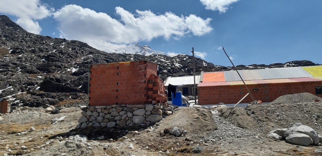 Iniziamo a scendere per la strada sterrata e dopo circa mezzora, a nostra sorpresa vediamo un Van venirci incontro. La nostra guida, per farci risparmiare energie per scalare il 6000 nei due giorni successivi ci ha chiamato un Van che ci avrebbe portati direttamente al Campo Base. Una gioia incredibile da parte nostra! La guida ci aveva fatto veramente una bellissima sorpresa! Saliamo sul Van e scendiamo per la strada sterrata molto sconnessa, dopo aver superato qualche tornante la strada sterrata diventa innevata e nel mentre che stiamo percorrendo un tornante, purtroppo il Van non curva, scivola e resta in bilico sul bordo della strada. Siamo in equilibrio e sotto di noi ci sono le rocce. Immediatamente l’autista ci fa uscire dal Van, siamo veramente in pericolo. Subito, assieme ai miei compagni di spedizione ci appendiamo al portapacchi del Van e l’autista, con una virata rocambolesca riesce a rimetterlo subito in strada. Ci è veramente andata bene! Risaliamo sul mezzo e dopo circa mezz’ora giungiamo alla meravigliosa “Laguna Zongo” m. 4300. Arriviamo sulla strada principale, a fondo valle e iniziamo a salire la ripida vallata. Dopo pochi minuti arriviamo al Zongo Pass m. 4700. Risaliamo un pezzettino di versante della montagna sul versante sinistro del passo e in pochissimo tempo arriviamo al Campo Base. Una bellissima baracca con cucina, sala da pranzo, un atrio con dei bei tavoli dove poter giocare a carte e due cameroni con comodissimi letti a castello per dormire.