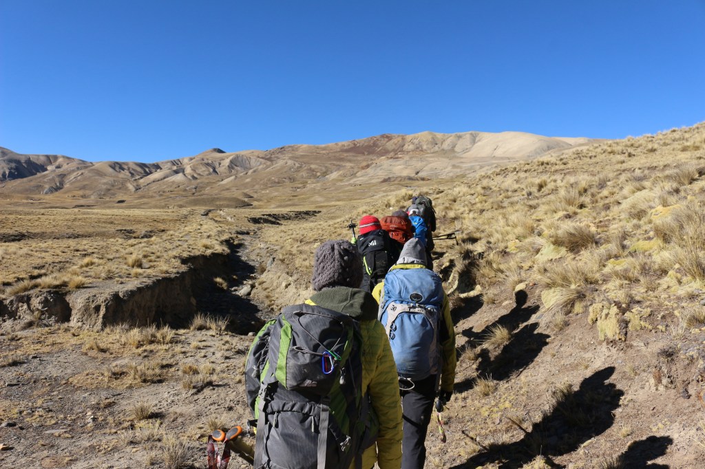 La mattina del 16 agosto, la sveglia suona verso le 7.30. Dopo aver fatto una buonissima colazione, prepariamo gli zaini, carichiamo i duffel sui muli e partiamo. Il programma di oggi consiste nell’arrivare al Campo Base dell’Huayna Potosi al Zongopass. Verso le 8 ci mettiamo in marcia. Sulla nostra sinistra possiamo ammirare la Parete Ovest dell’Huayna Potosi, una parete ghiacciata di circa 1100 metri di dislivello piena di lingue di ghiaccio e seracchi, da quel versante l’Huayna Potosi compare come una vera e propria piramide, uno spettacolo magnifico.